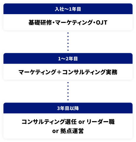 マーケティングを継続しながら、徐々に自分自身でコンサルティングを担当。顧客へのヒアリングから提案まで、一連の流れをワンストップで行う力を身につけていきます。